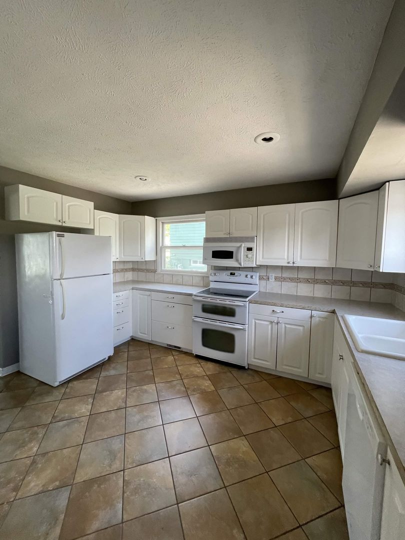 White kitchen cabinets with tile floor and included appliances