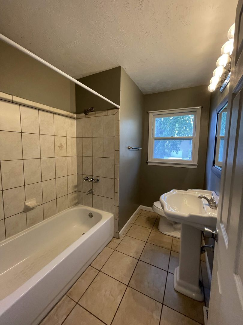 Tile flooring and tub/shower combo in main floor full bath