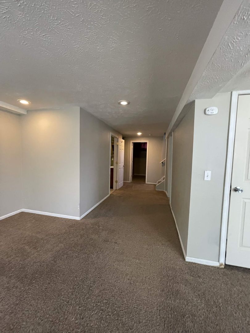 The main floor has a living room with newer carpet, a kitchen with white cabinets and included appliances, and bedrooms with ceiling fans and updated dark carpet. One of the main floor rooms has hardwood floors instead of carpet. The full bath has tile around the tub and a pedestal sink.